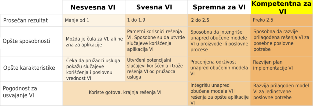 Organizacije koje spadaju u istu AIRI kategoriju imaju tendenciju da prikažu slične sposobnosti i karakteristike; tabela ispod ilustruje opšte sposobnosti, karakteristike, pogodnost organizacija za usvajanje VI u svakoj kategoriji Spremnosti za VI.
